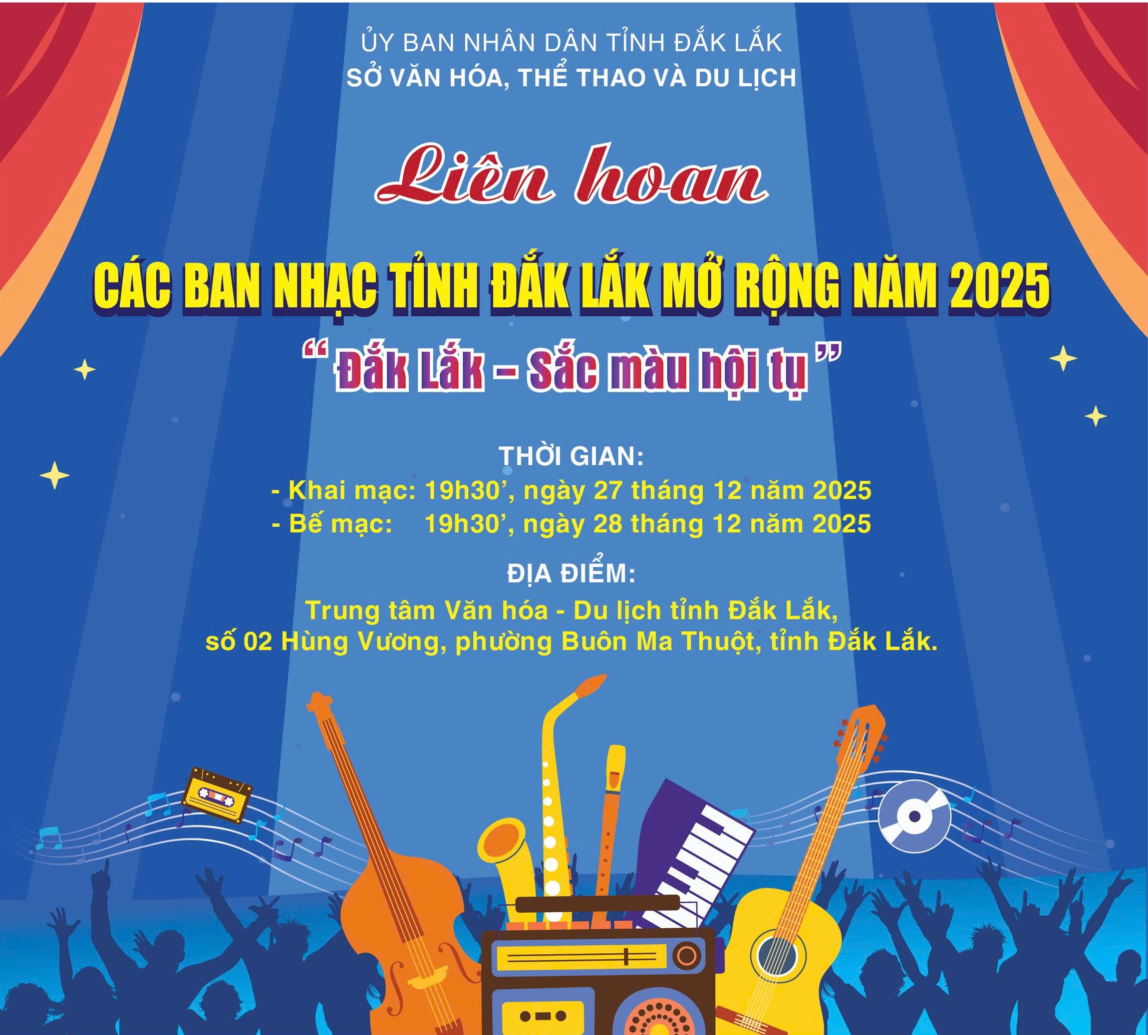 Trong 2 ngày 27 và 28/12/2025, Sở Văn hóa, Thể thao và Du lịch Đắk Lắk sẽ tổ chức Liên hoan các Ban nhạc tỉnh Đắk Lắk mở rộng năm 2025 với chủ đề: “Đắk Lắk - Sắc màu hội tụ”