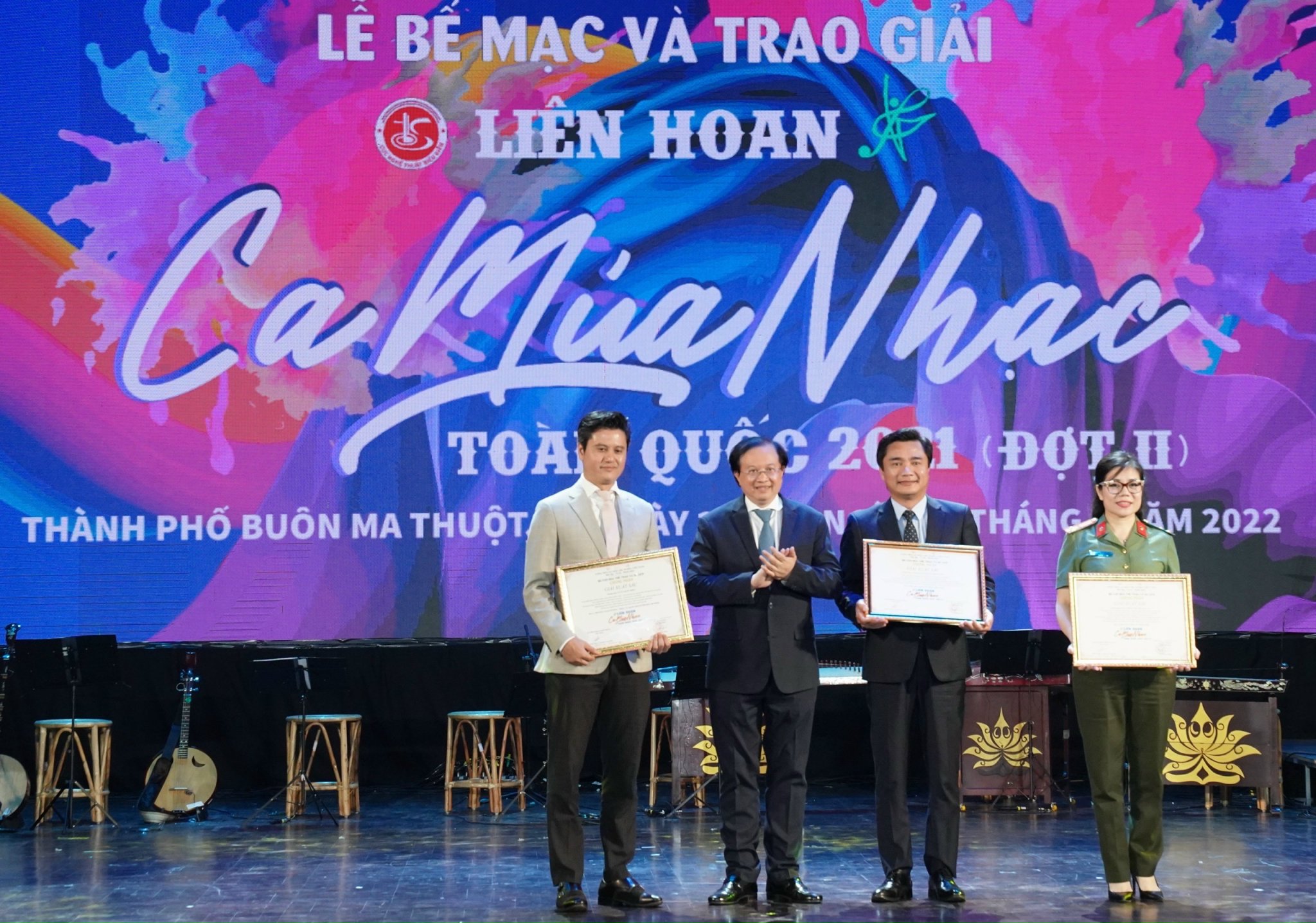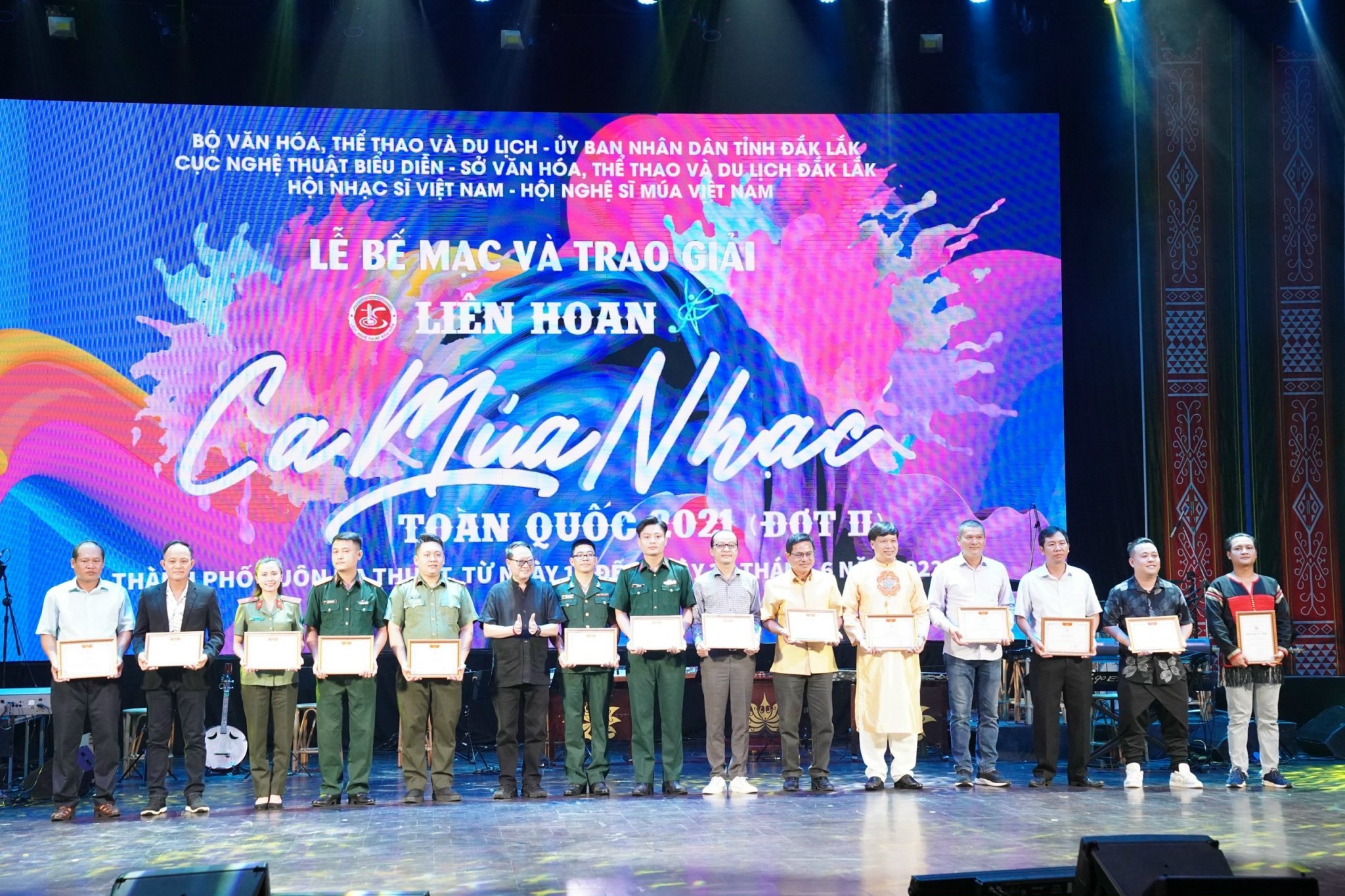 Sau 13 ngày diễn ra sôi nổi (17 - 30/6), Lễ bế mạc và trao giải Liên hoan Ca, Múa, Nhạc toàn quốc năm 2021 (đợt 2) đã diễn ra vào tối 30/6 tại Trung tâm Văn hóa tỉnh Đắk Lắk. Liên hoan do Cục Nghệ thuật biểu diễn (Bộ Văn hóa, Thể thao và Du lịch) phối hợp Hội Nhạc sĩ Việt Nam, Hội Nghệ sĩ Múa Việt Nam và Sở Văn hóa, Thể thao và Du lịch tỉnh Đắk Lắk tổ chức.