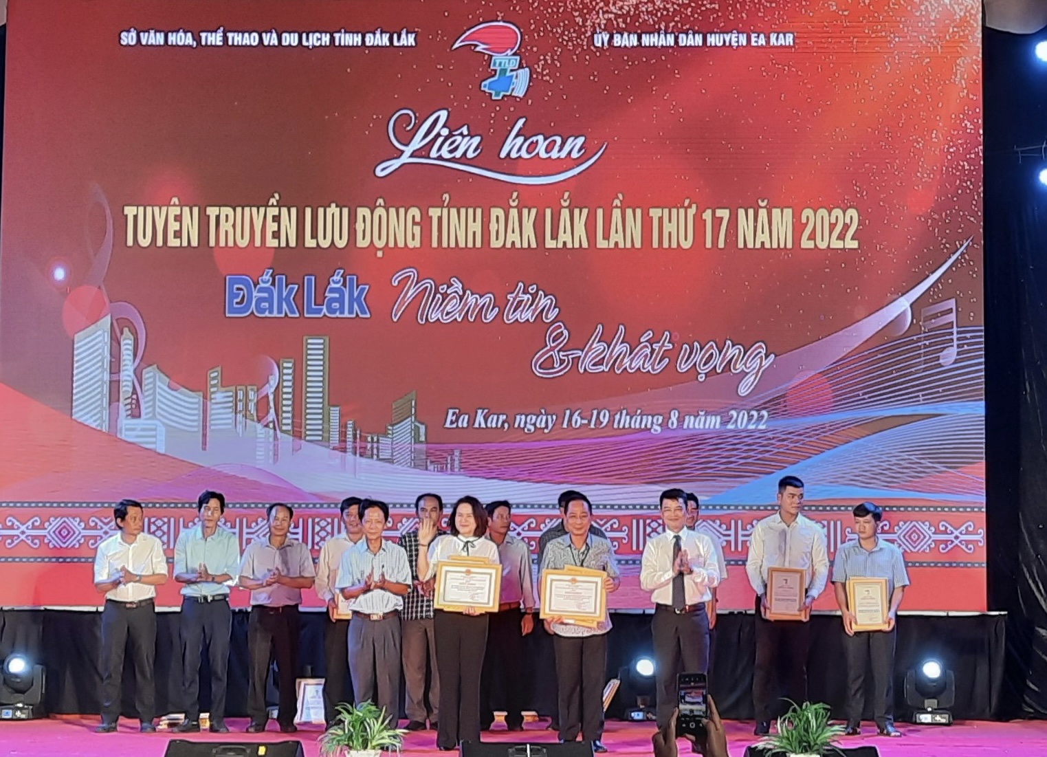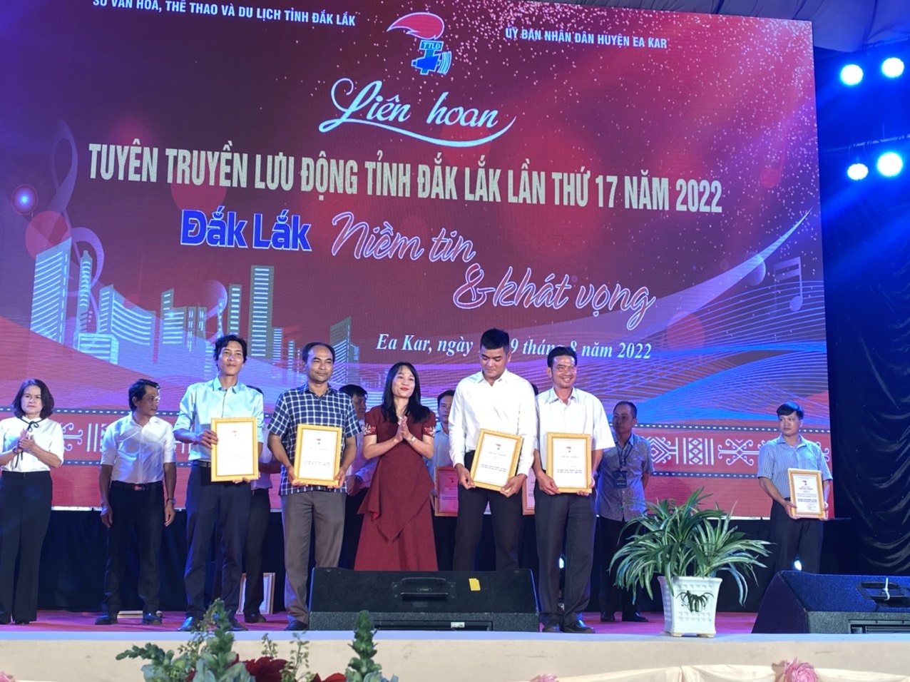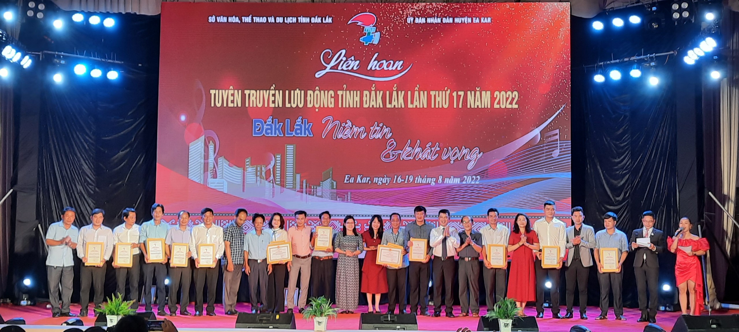 Kết thúc Liên hoan, Ban Tổ chức đã trao: 01 giải Tuyên truyền viên xuất sắc, 01 giải Tiểu phẩm xuất sắc; 06 giải C, 05 giải B, 03 giải A cho phần thi Xe Tuyên truyền cổ động và phần thi Chương trình tuyên truyền tổng hợp; 08 giải C, 04 giải B, 02 giải A giải Toàn đoàn cho thành phố Buôn Ma Thuột và huyện Krông Pắc. Ngoài ra, 02 Đoàn đạt giải A toàn đoàn và Giấy khen của Giám đốc Sở Văn hóa, Thể thao và Du lịch./.