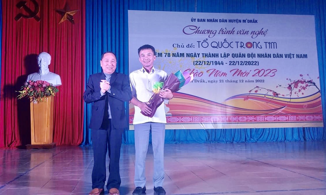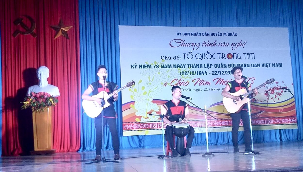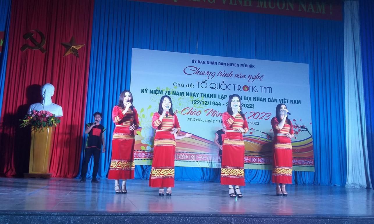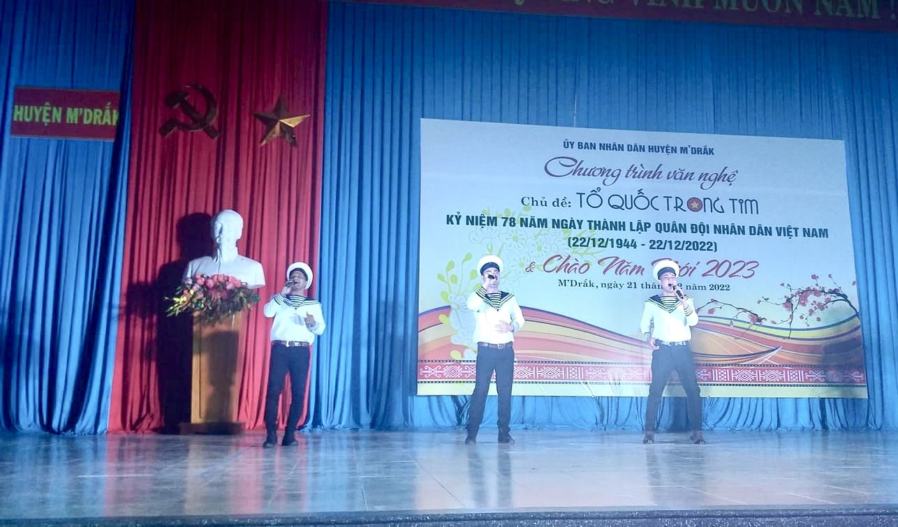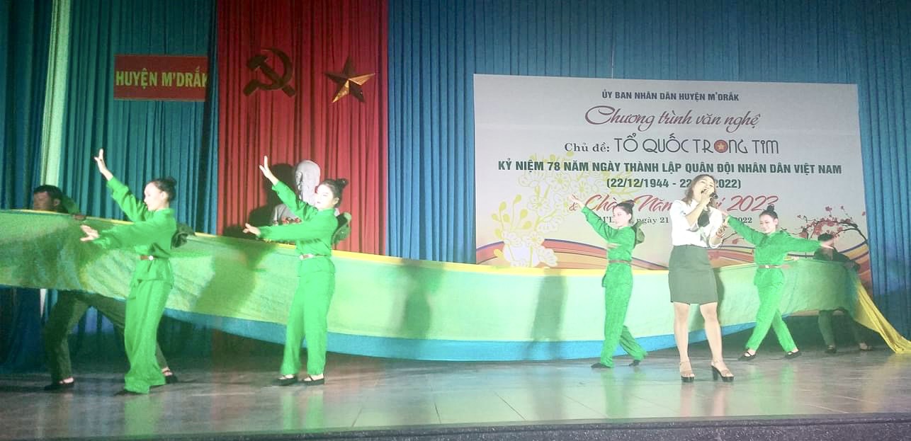 Từ ngày 16/12 đến 22/12/2022, Trung tâm Văn hóa tỉnh phối hợp Phòng Văn hóa và Thông tin huyện M’Drắk biểu diễn Chương trình tuyên truyền kỷ niệm 78 năm Ngày thành lập Quân đội Nhân dân Việt Nam (22/12/1944 – 22/12/2022), kỷ niệm 33 năm Ngày hội Quốc phòng toàn dân (22/12/1989 - 22/12/2022) và Chào năm mới 2023 với chủ đề “Tổ quốc trong tim” tại một số xã của huyện M’Drắk.