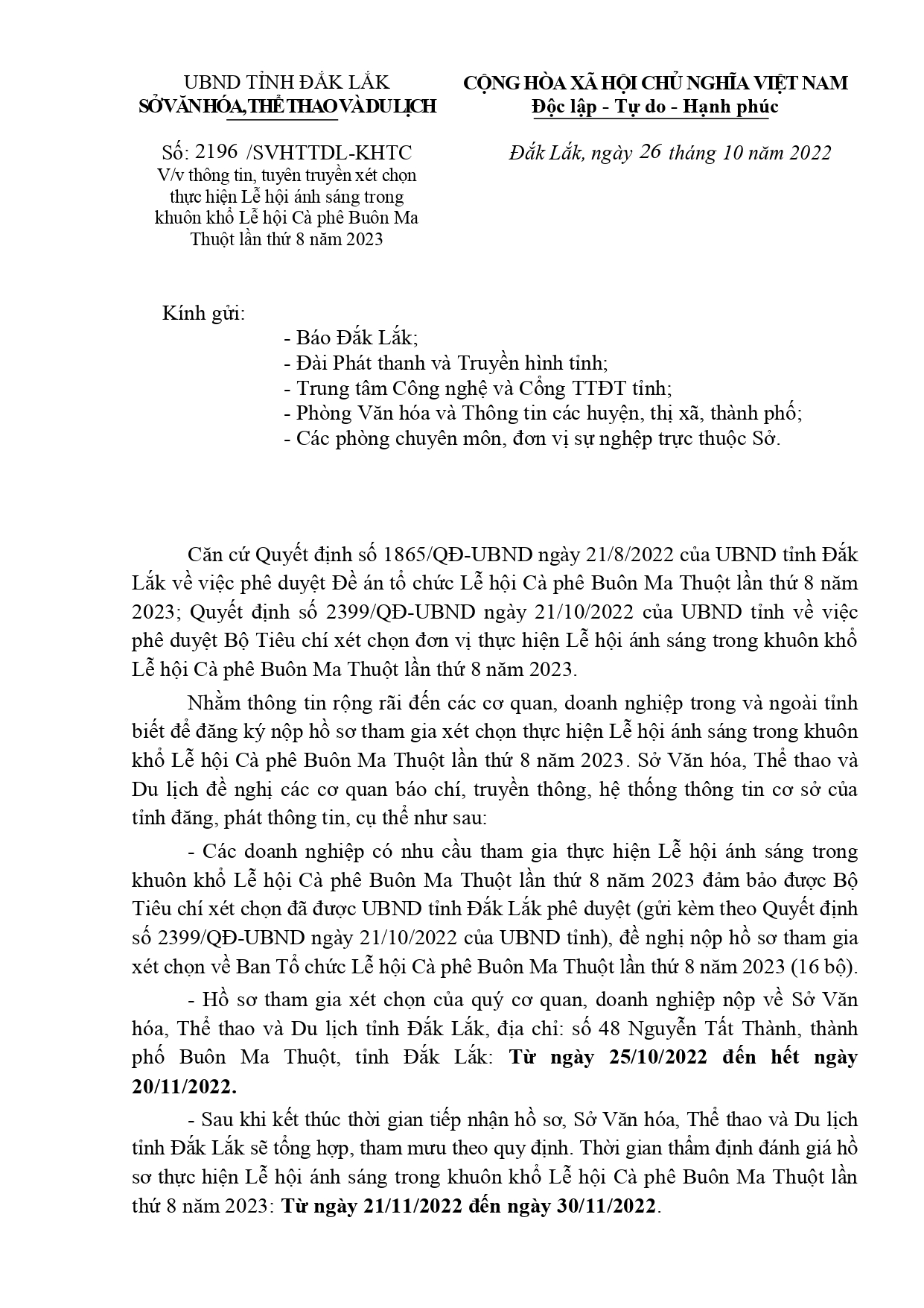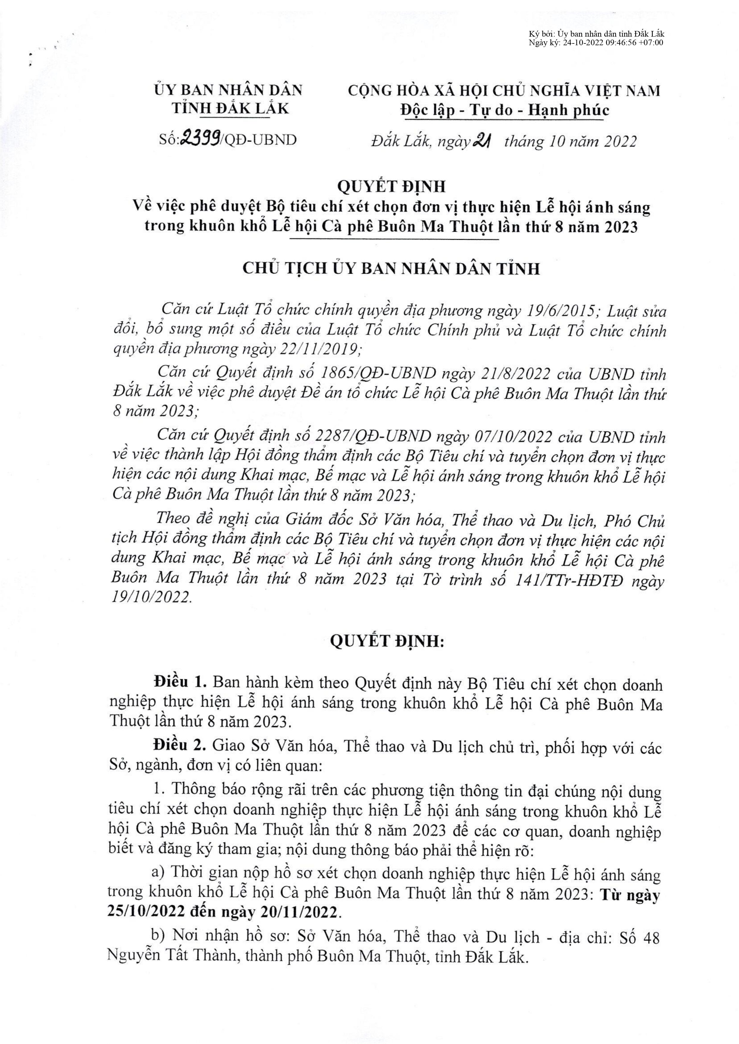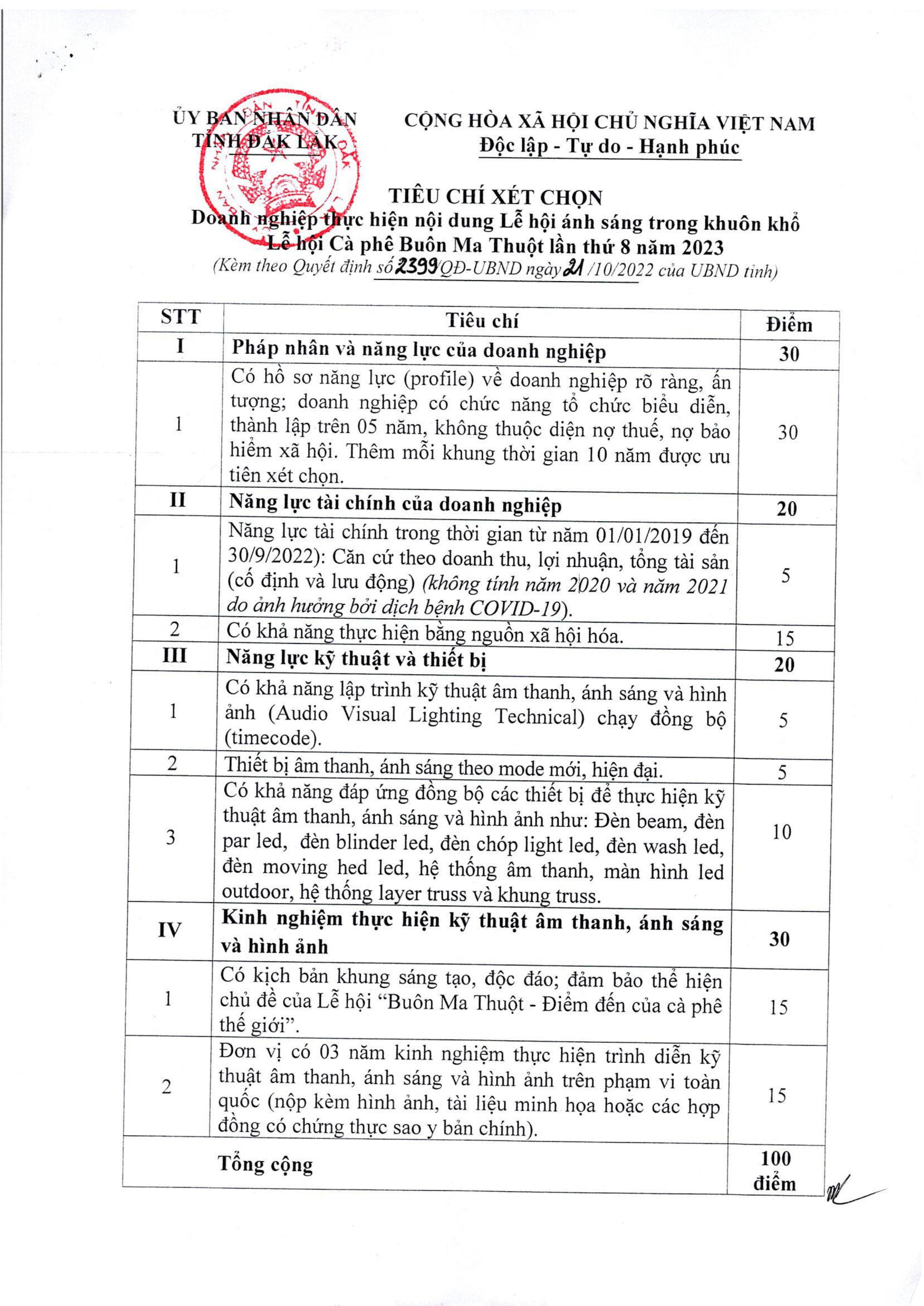 Bộ Tiêu chí xét chọn đơn vị thực hiện Lễ hội ánh sáng trong khuôn khổ Lễ hội Cà phê Buôn Ma Thuột lần thứ 8 năm 2023.