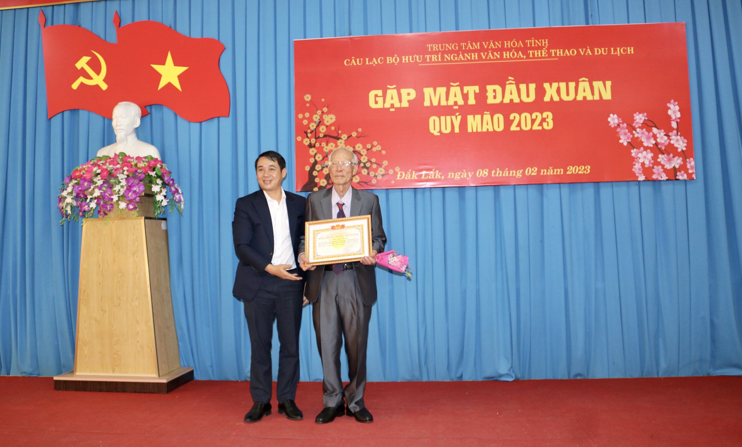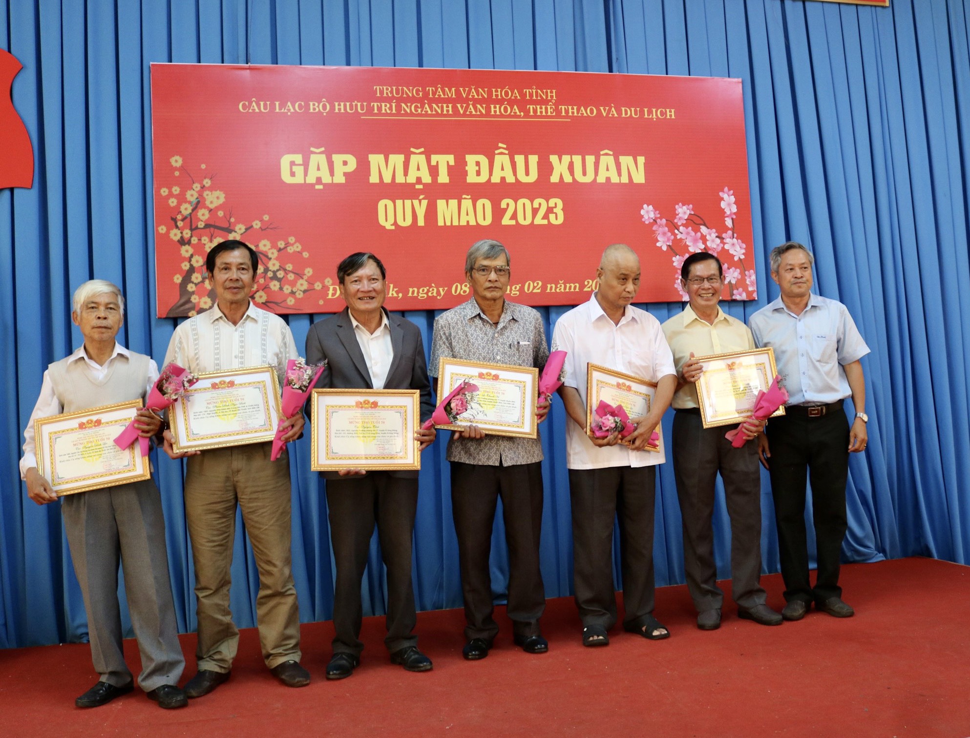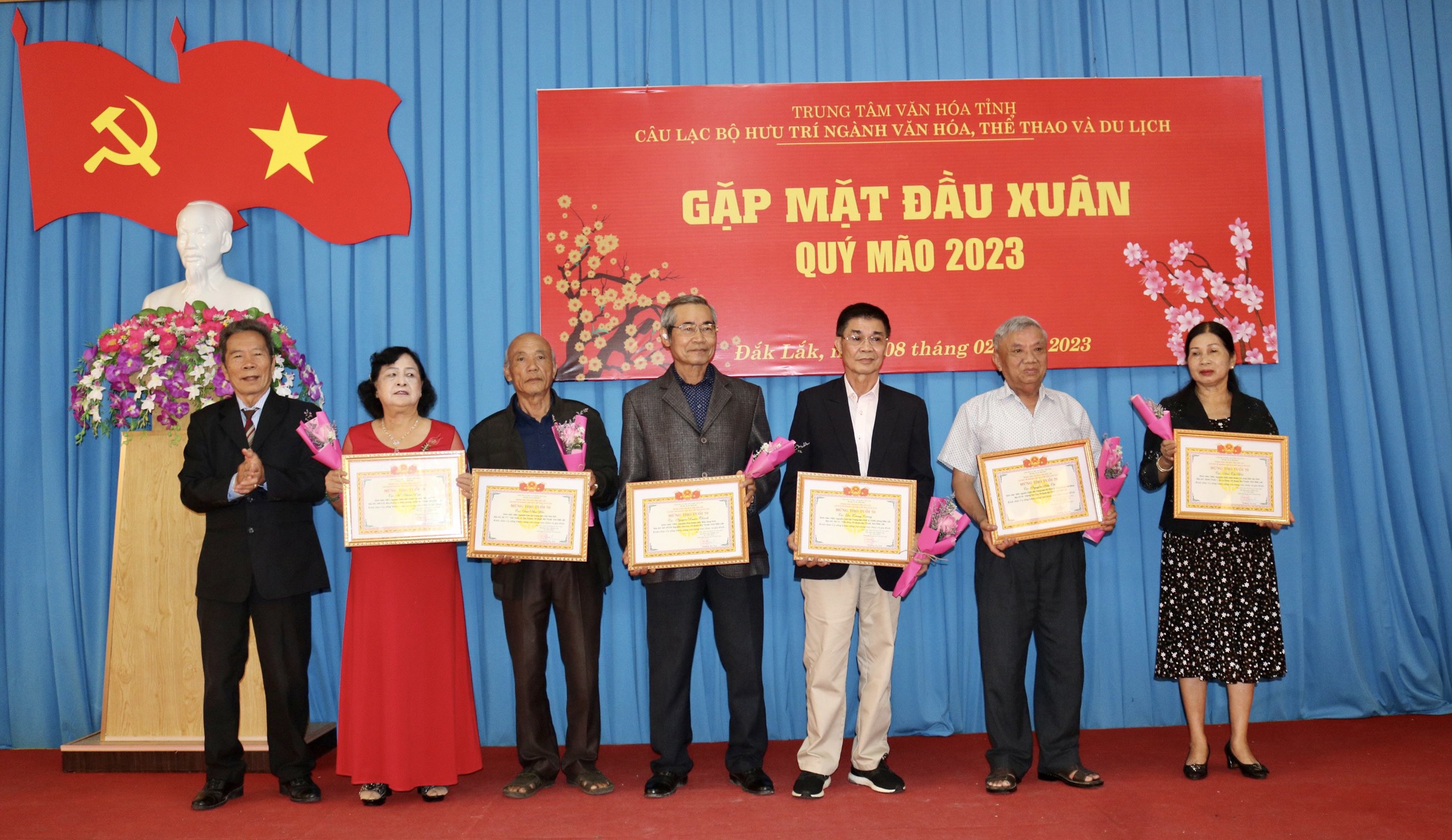 Sáng ngày 08/02/2023, Câu lạc bộ Hưu trí Ngành Văn hóa, Thể thao và Du lịch tỉnh Đắk Lắk thuộc Trung tâm Văn hóa tỉnh tổ chức gặp mặt đầu xuân Quý Mão, triển khai chương trình hoạt động năm 2023 và trao Giấy mừng thọ tuổi 70, 75, 80, 85, 90 cho 40 Hội viên của Câu lạc bộ. Tham dự buổi gặp mặt có ông Lại Đức Đại, Phó Giám đốc Sở Văn hóa, Thể thao và Du lịch; bà Trương Thị Ánh, Giám đốc Trung tâm Văn hóa tỉnh cùng các thành viên trong Ban Giám đốc của Trung tâm.