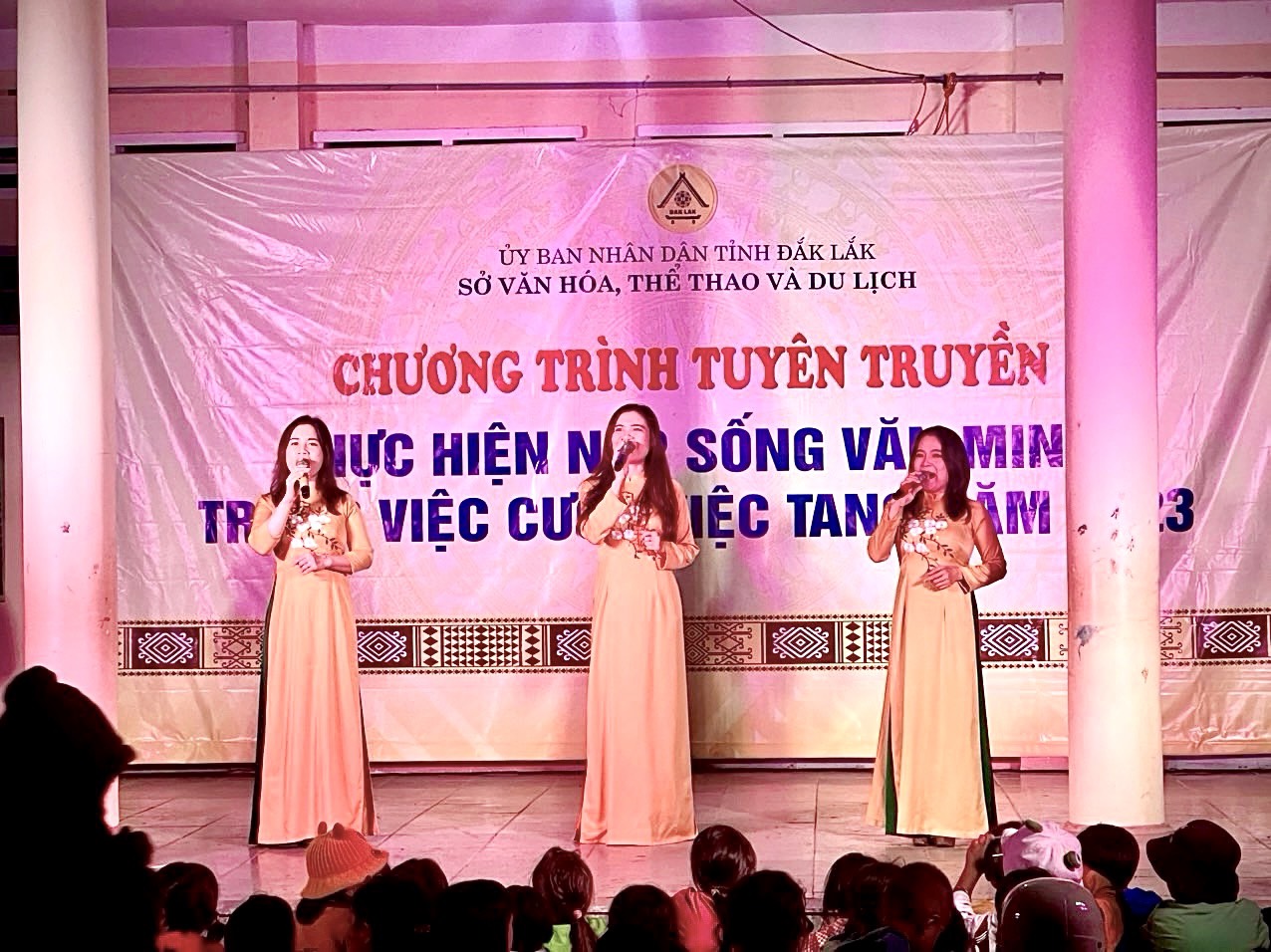 Thực hiện Kế hoạch số 947/KH-SVHTTDL ngày 04/5/2023 của Sở Văn hóa, Thể thao và Du lịch về việc tuyên truyền thực hiện nếp sống văn minh trong việc cưới, việc tang năm 2023, Đội Tuyên truyền lưu động (Trung tâm Văn hóa tỉnh) tổ chức chương trình văn nghệ tổng hợp, biểu diễn phục vụ cơ sở tại 03 huyện gồm: Krông Búk, Buôn Đôn, Ea Súp.