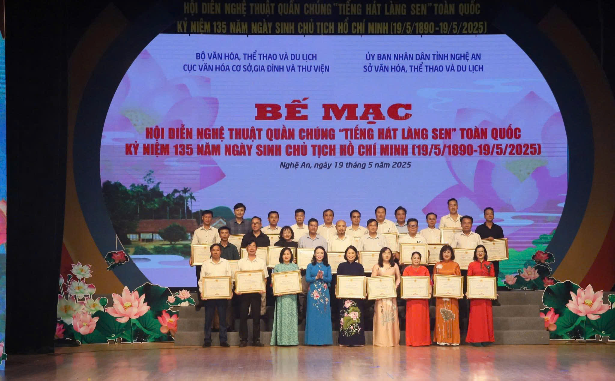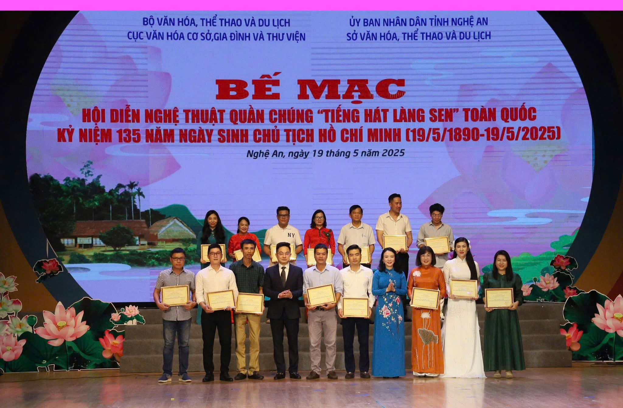 Từ ngày 16-19/5, tại TP Vinh, tỉnh Nghệ An, Cục Văn hóa cơ sở, Gia đình và Thư viện (Bộ Văn hóa, Thể thao và Du lịch) phối hợp với Sở Văn hóa, Thể thao và Du lịch tỉnh Nghệ An tổ chức Hội diễn nghệ thuật quần chúng "Tiếng hát Làng Sen" toàn quốc năm 2025. Đây là một trong những sự kiện nằm trong chuỗi hoạt động của Lễ hội Làng Sen năm 2025, kỷ niệm 135 năm Ngày sinh Chủ tịch Hồ Chí Minh (19/5/1890 - 19/5/2025).