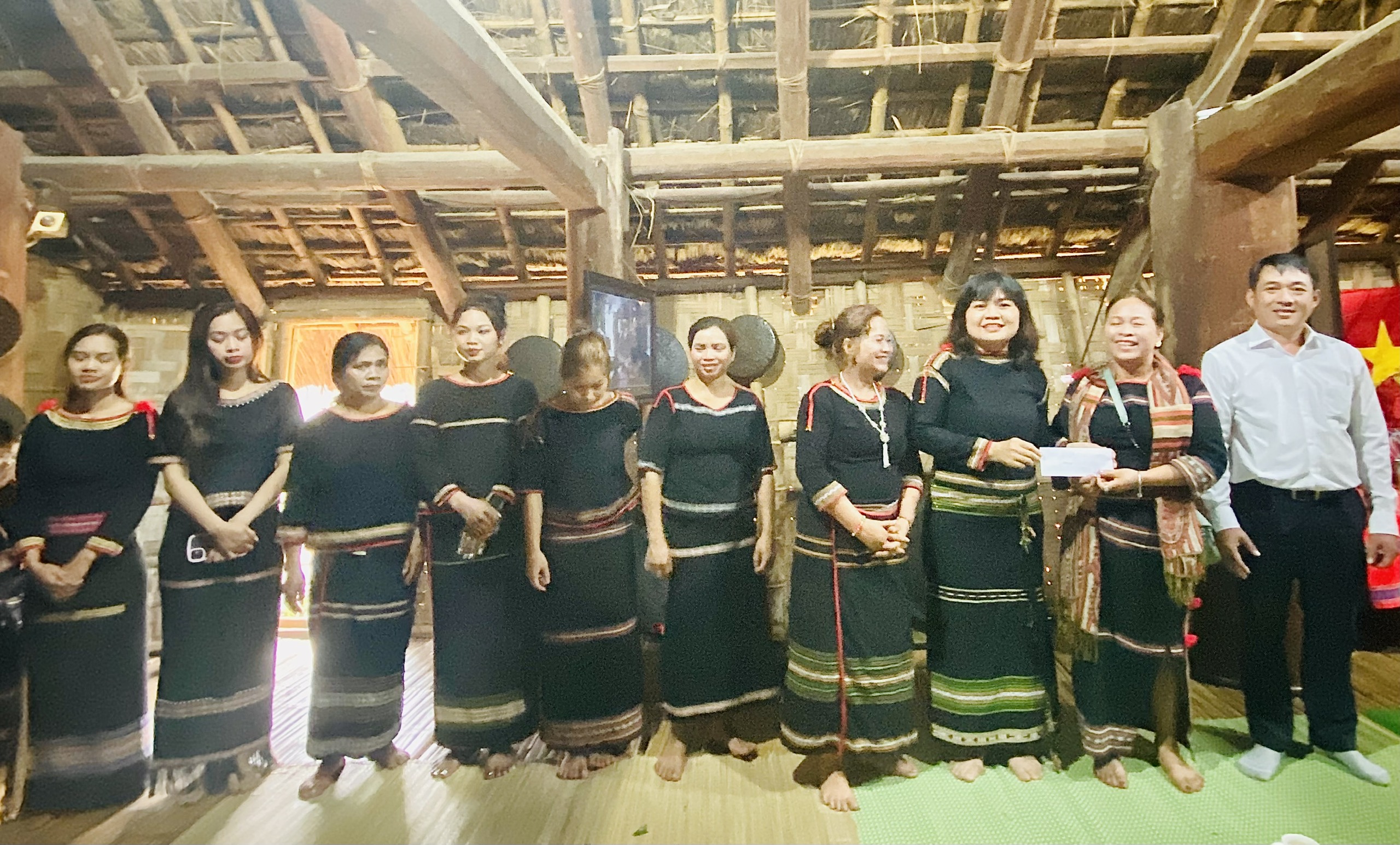 Bà H’Yim Kđoh- Phó Chủ tịch UBND tỉnh cùng lãnh đạo Sở VHTTDL thăm, tặng quà nhóm nghệ nhân hoạt động hàng ngày tại Làng nhân dịp Ngày Văn hóa các dân tộc Việt Nam 19/4/2023