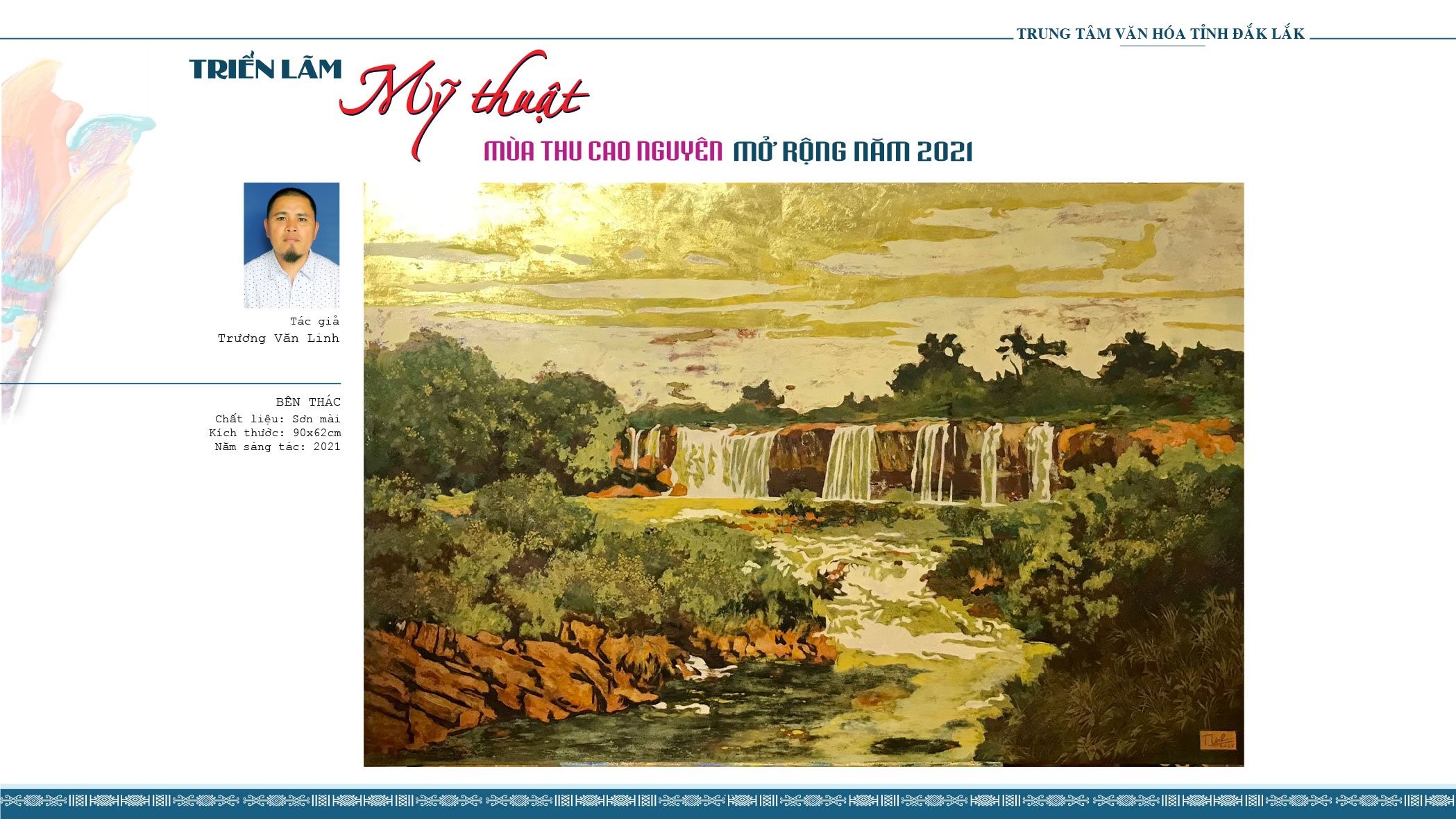 Là người nhiều năm gắn bó với hoạt động của Trung tâm, Họa sĩ Trương Văn Linh, Chủ nhiệm CLB Mỹ thuật Trung tâm Văn hóa tỉnh luôn dành sự quan tâm đặc biệt cho triển lãm, nhất là Triển lãm Mỹ thuật “Mùa thu Cao Nguyên” mở rộng năm 2021 diễn ra từ ngày 15/11-30/11/2021. Với 05 tác phẩm sơn mài về chủ đề Tây Nguyên vào thu, phong cảnh, con người và vùng đất đại ngàn Tây Nguyên được chuyển tải sinh động đến người xem. Từng nét chấm phá đã vẽ nên khung cảnh nên thơ, đượm chất thu và tạo cảm hứng cho người xem. Họa sĩ Trương Văn Linh chia sẻ thêm: “Bên cạnh việc đầu tư không gian trưng bày tại Trung tâm Văn hóa tỉnh để tôn vinh tác giả, tác phẩm thì trong bối cảnh dịch bệnh COVID-19, việc thưởng thức nghệ thuật, mỹ thuật nhất thiết phải có sự thay đổi. Thông qua công nghệ số, người yêu mỹ thuật có thể thưởng lãm được tranh, ảnh với nhiều hình thức khác nhau. Thành công của Triển lãm Mỹ thuật năm 2021 của đơn vị đã mở ra cơ hội giao lưu cho đông đảo tác giả, truyền cảm hứng đối với thế hệ trẻ đam mê nghệ thuật. Đồng thời, góp phần đưa mỹ thuật đến gần hơn với công chúng yêu nghệ thuật, giúp người xem có những trải nghiệm mới mẻ và ấn tượng khó quên”.