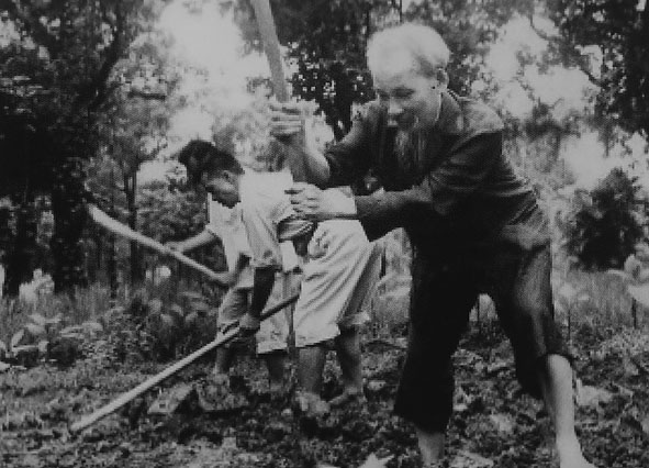 Chủ tịch Hồ Chí Minh cuốc đất, trồng rau trong vườn tại Phủ Chủ tịch, năm 1957. Ảnh tư liệu