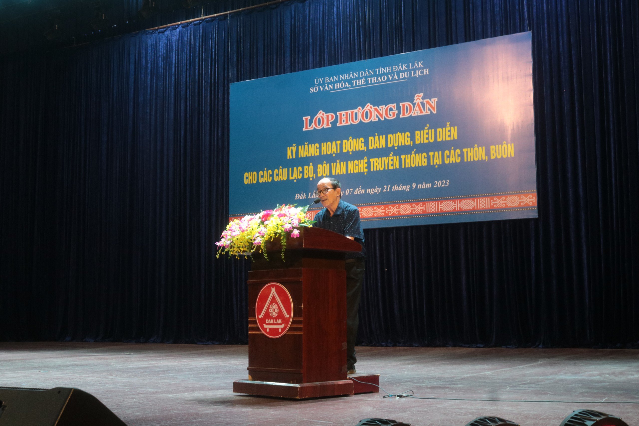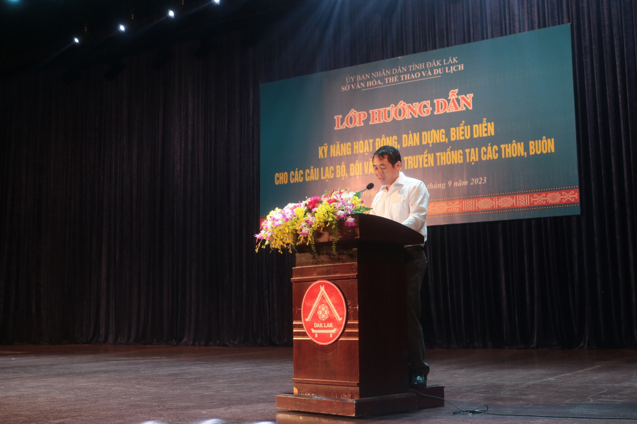 Sáng ngày 07/9/2023, tại Trung tâm Văn hóa tỉnh, Sở Văn hóa, Thể thao và Du lịch tổ chức Khai giảng Lớp hướng dẫn kỹ năng hoạt động, dàn dựng, biểu diễn cho các câu lạc bộ, đội văn nghệ truyền thống tại các thôn, buôn. Ông Lại Đức Đại, Phó Giám đốc Sở Văn hóa, Thể thao và Du lịch; đại diện lãnh đạo các phòng chuyên môn, đơn vị sự nghiệp trực thuộc Sở, đại diện lãnh đạo Phòng Văn hóa và Thông tin các huyện và gần 268 hội viên của 11 câu lạc bộ tại thôn, buôn vùng đồng bào dân tộc thiểu số các huyện: Ea Súp, Krông Năng, Cư Kuin, Ea H’leo, Krông Bông, Krông Pắc, Krông Ana tham dự.
