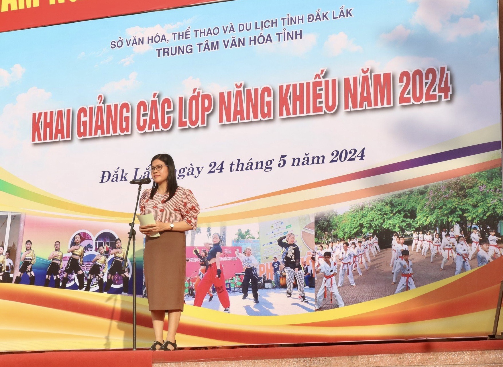 Phát biểu tại Chương trình, bà Trương Thị Ánh, Giám đốc Trung tâm Văn hóa tỉnh đã nêu lợi ích của việc rèn luyện năng khiếu, kỹ năng cho các em thiếu nhi. Trong năm 2023, TTVH tỉnh đã chiêu sinh thường xuyên 12 lớp năng khiếu thu hút gần 1000 lượt học viên tham gia. 5 tháng đầu năm 2024, chiêu sinh 11 lớp năng khiếu với gần 400 lượt học viên tham gia. Để tổ chức tốt hơn nữa hoạt động của các lớp năng khiếu tại Trung tâm Văn hóa tỉnh trong thời gian tới, phòng chuyên môn cần có sự phối hợp chặt chẽ cùng các thầy cô giáo tiếp tục phát huy tinh thần, trách nhiệm, sự nhiệt tình giảng dạy để giúp các em có môi trường rèn luyện học tập vui tươi, lành mạnh, có thêm nhiều kỹ năng, kiến thức, tự tin hơn trong hành trình học tập rèn luyện thể hiện bản thân.