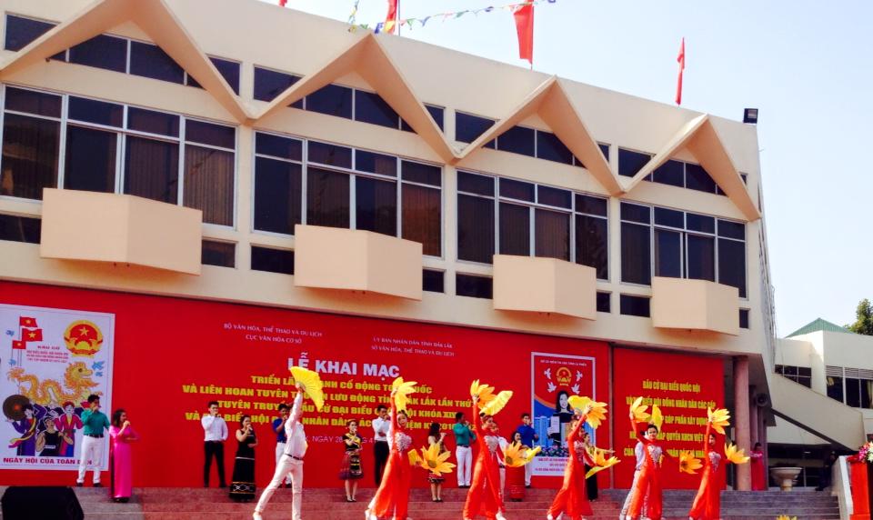 Sáng 28 tháng 4, tại Trung tâm Văn hóa tỉnh, Cục Văn hóa cơ sở (Bộ VHTTDL) và Sở Văn hóa, Thể thao và Du lịch tỉnh Đắk Lắk đã phối hợp tổ chức Lễ khai mạc Triển lãm tranh cổ động tấm lớn tuyên truyền cuộc Bầu cử đại biểu Quốc hội khóa XIV và đại biểu Hội đồng nhân dân các cấp nhiệm kỳ 2016 – 2021 và Liên hoan Tuyên truyền lưu động tỉnh Đắk Lắk lần thứ XV - năm 2016. Đến dự có các đồng chí lãnh đạo Cục Văn hóa cở sở, UBND tỉnh, Sở Văn hóa, Thể thao và Du lịch; Lãnh đjao các sở ngành cùng đông đảo nhân dân.