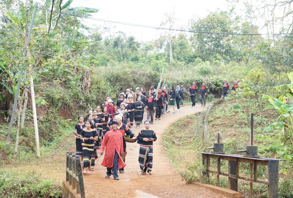 Thầy cúng và người dân trong buôn di chuyển đến bến nước.