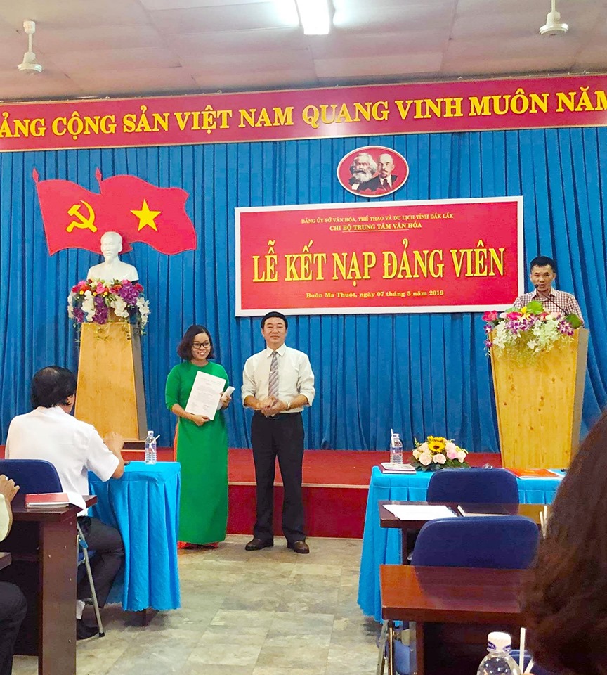 Sáng ngày 07/5/2019, Chi bộ Trung tâm Văn hóa đã tổ chức Lễ kết nạp Đảng viên mới cho quần chúng ưu tú Đỗ thị Trường An, Kế toán viên. Lễ kết nạp diễn ra trong không khí trang nghiêm và theo đúng trình tự, thủ tục kết nạp đảng viên mới. Tại buổi Lễ kết nạp, đồng chí Lê Kim Quang, Bí thư Chi bộ, Phó Giám đốc Trung tâm Văn hóa đã trao Quyết định kết nạp và giao nhiệm vụ cho đảng viên mới Đỗ Thị Trường An; đồng thời phân công các đồng chí đảng viên chính thức trong chi bộ tiếp tục giúp đỡ, dìu dắt đồng chí trong thời gian thử thách 12 tháng.