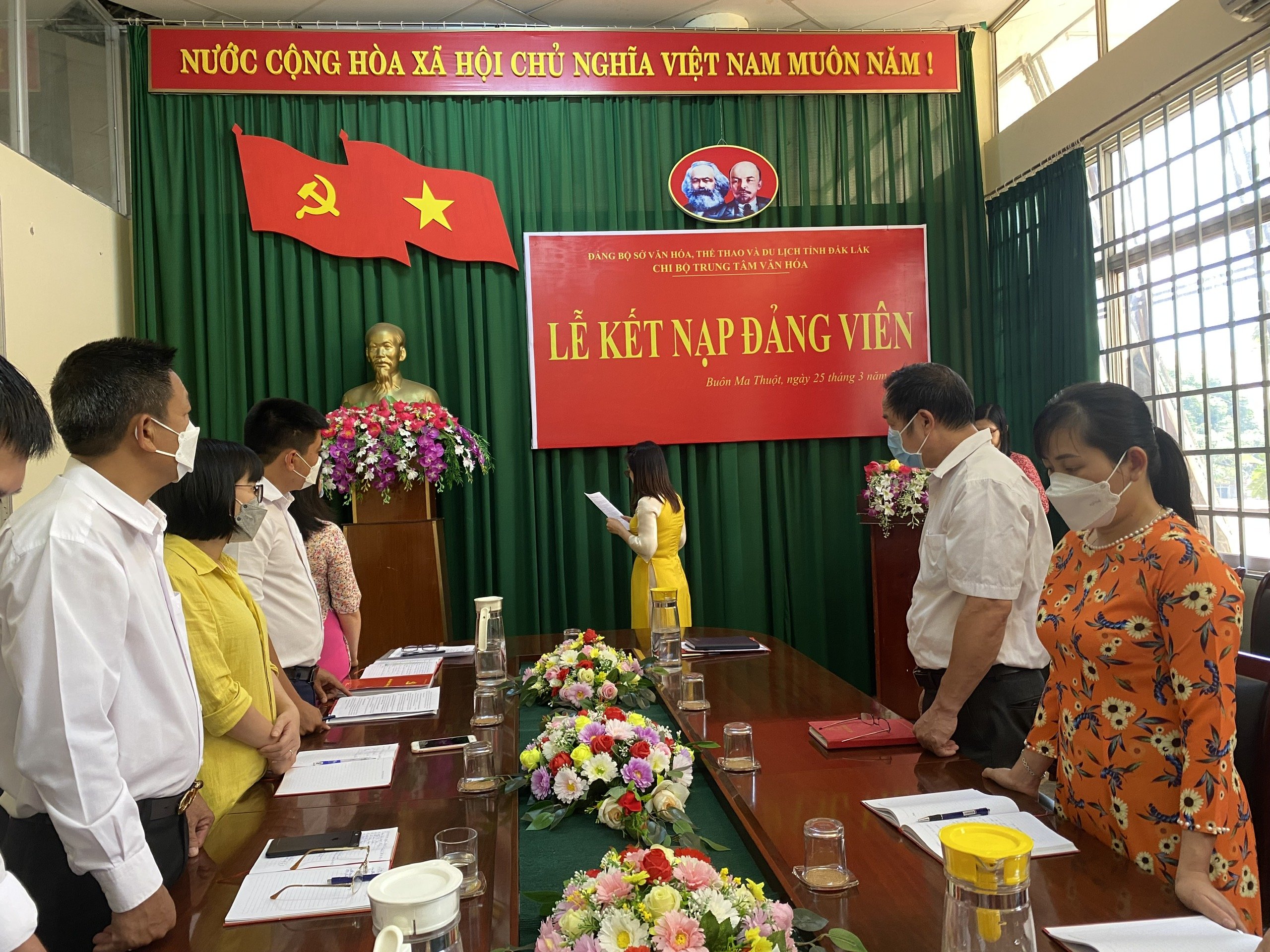 Được sự đồng ý của Đảng ủy Sở Văn hóa, Thể thao và Du lịch tỉnh Đắk Lắk, chiều ngày 25/3, tại Phòng họp Trung tâm Văn hóa tỉnh, Chi bộ Trung tâm Văn hóa tỉnh đã trang trọng tổ chức Lễ Kết nạp Đảng viên mới. Toàn bộ Đảng viên của Chi bộ và đại diện đoàn viên ưu tú thuộc Công đoàn bộ phận, Chi đoàn thanh niên đã đến dự buổi lễ.