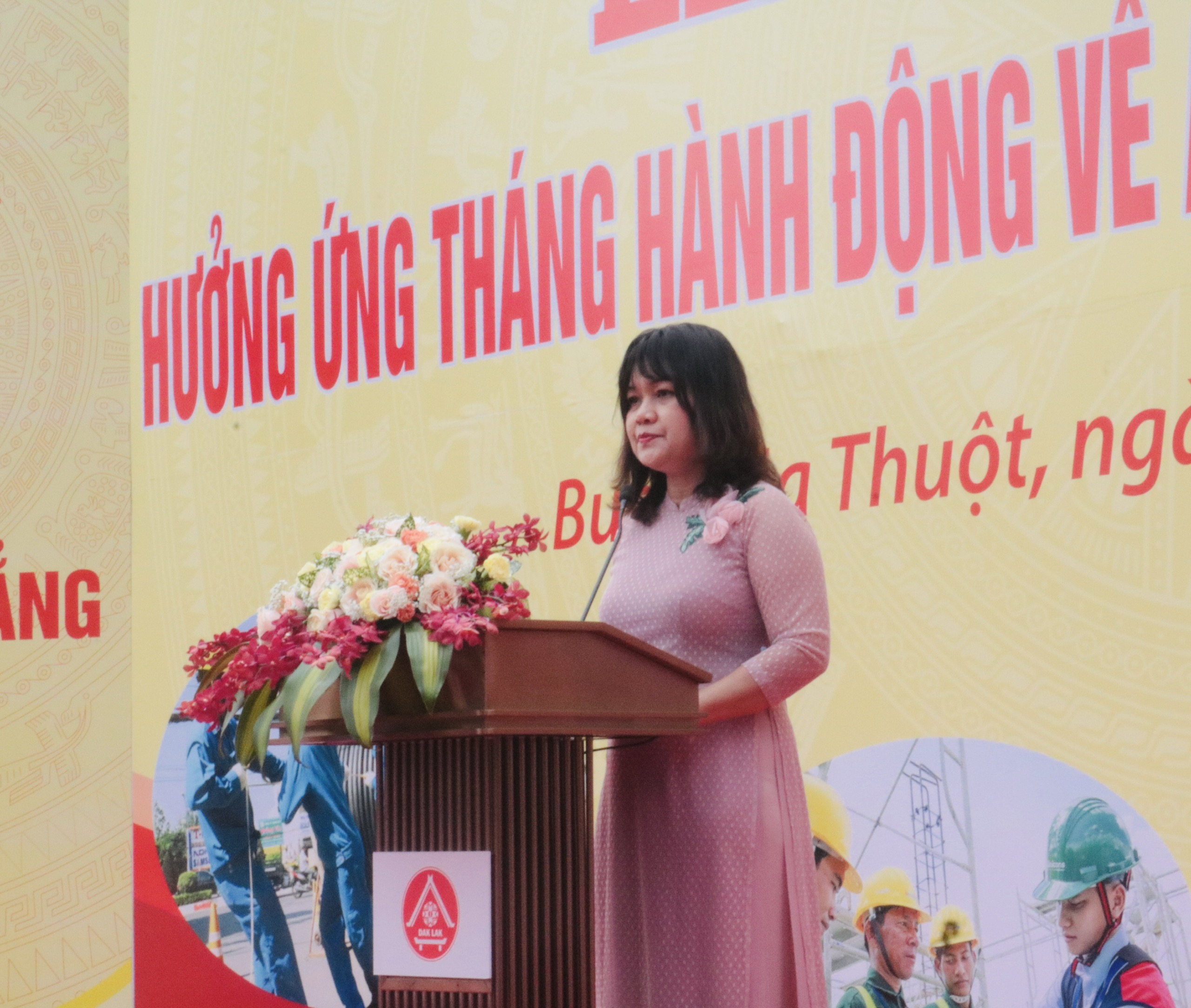 Phát biểu tại buổi lễ phát động, bà H’Yim Kđok, Tỉnh ủy viên, Phó Chủ tịch UBND tỉnh, Trưởng Ban chỉ đạo Tháng hành động về an toàn, vệ sinh lao động tỉnh nhấn mạnh đến một số nội dung nhằm hạn chế những nguy cơ rủi ro về an toàn, vệ sinh lao động, tạo nên một môi trường làm việc tốt hơn, an toàn hơn như tập trung đẩy mạnh tổ chức các hoạt động hưởng ứng Tháng hành động về An toàn, vệ sinh lao động năm 2023 theo Kế hoạch số 11/KH-UBND ngày 19/01/2023 của UBND tỉnh; đẩy mạnh các hoạt động thông tin, tuyên truyền, phổ biến kiến thức về an toàn, vệ sinh lao động đến người sử dụng lao động và người lao động; các doanh nghiệp, đơn vị quan tâm thường xuyên cải thiện điều kiện làm việc, chăm sóc sức khỏe người lao động; tất cả các doanh nghiệp tổ chức ký kết giao ước thi đua thực hiện các quy định an toàn, vệ sinh lao động; các cơ quan chức năng tăng cường công tác thanh tra, kiểm tra việc thực hiện các qui định về an toàn, vệ sinh lao động, phát hiện và xử lý nghiêm các hành vi vi phạm…