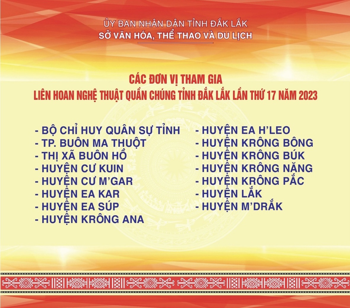 Liên hoan Nghệ thuật Quần chúng tỉnh Đắk Lắk lần thứ 17 năm 2023 diễn ra từ ngày 17/8 - 18/8/2023, có sự tham gia của 15 đoàn Nghệ thuật Quần chúng đến từ các đơn vị, địa phương: Bộ Chỉ huy Quân sự tỉnh, thành phố Buôn Ma Thuột, thị xã Buôn Hồ, các huyện: Cư Kuin, Cư M’gar, Ea H’leo, Ea Kar, Ea Súp, Krông Ana, Krông Bông, Krông Búk, Krông Năng, Krông Pắc, Lắk và M’Drắk.