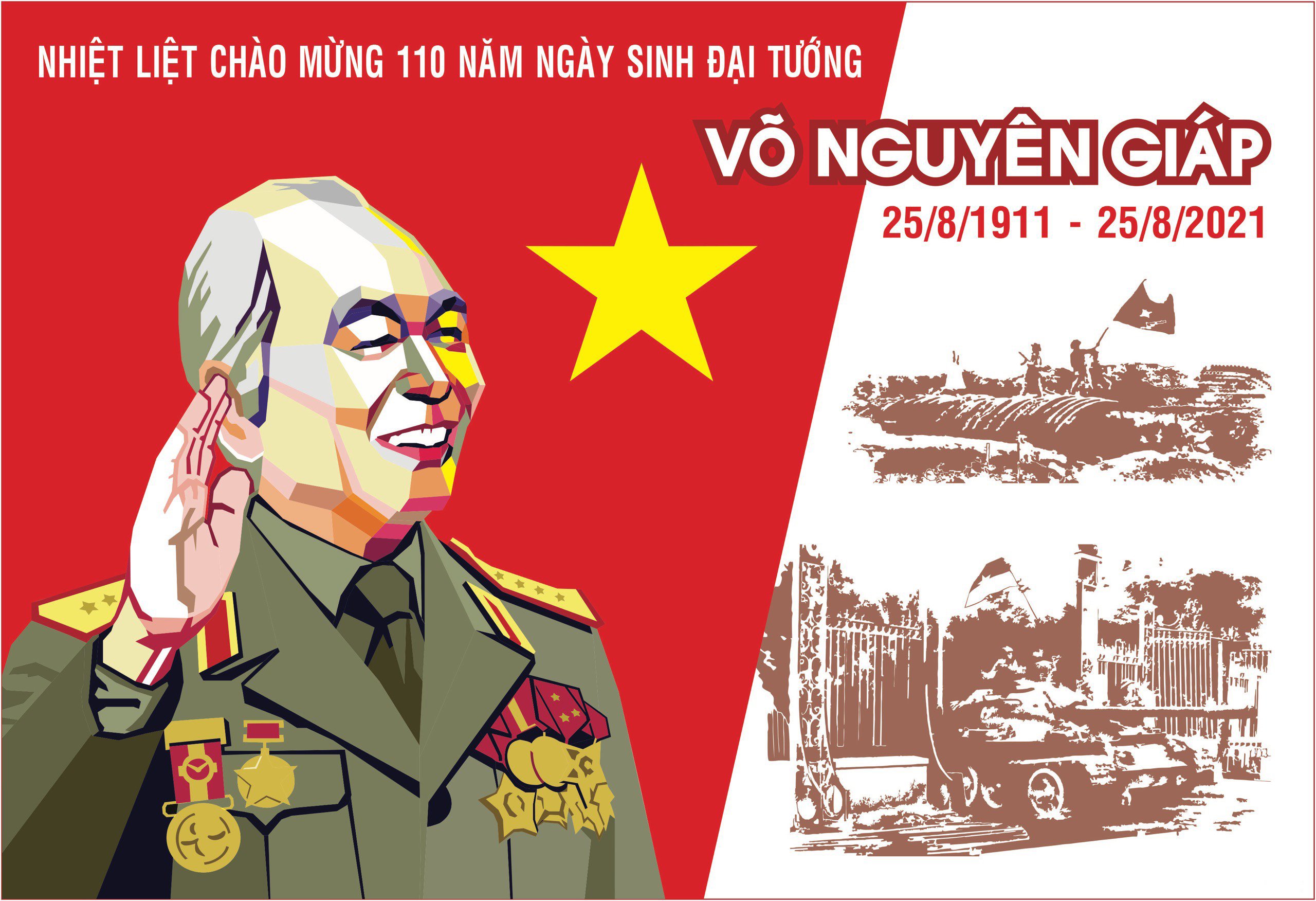 Mẫu tranh cổ động tuyên truyền kỷ niệm 110 năm Ngày sinh Đại tướng Võ Nguyên Giáp (25/8/1911 - 25/8/2021); kỷ niệm 76 năm Ngày Cách mạng tháng Tám thành công (19/8/1945 - 19/8/2021) và Ngày Quốc khánh nước Cộng hòa xã hội chủ nghĩa Việt Nam 2/9.