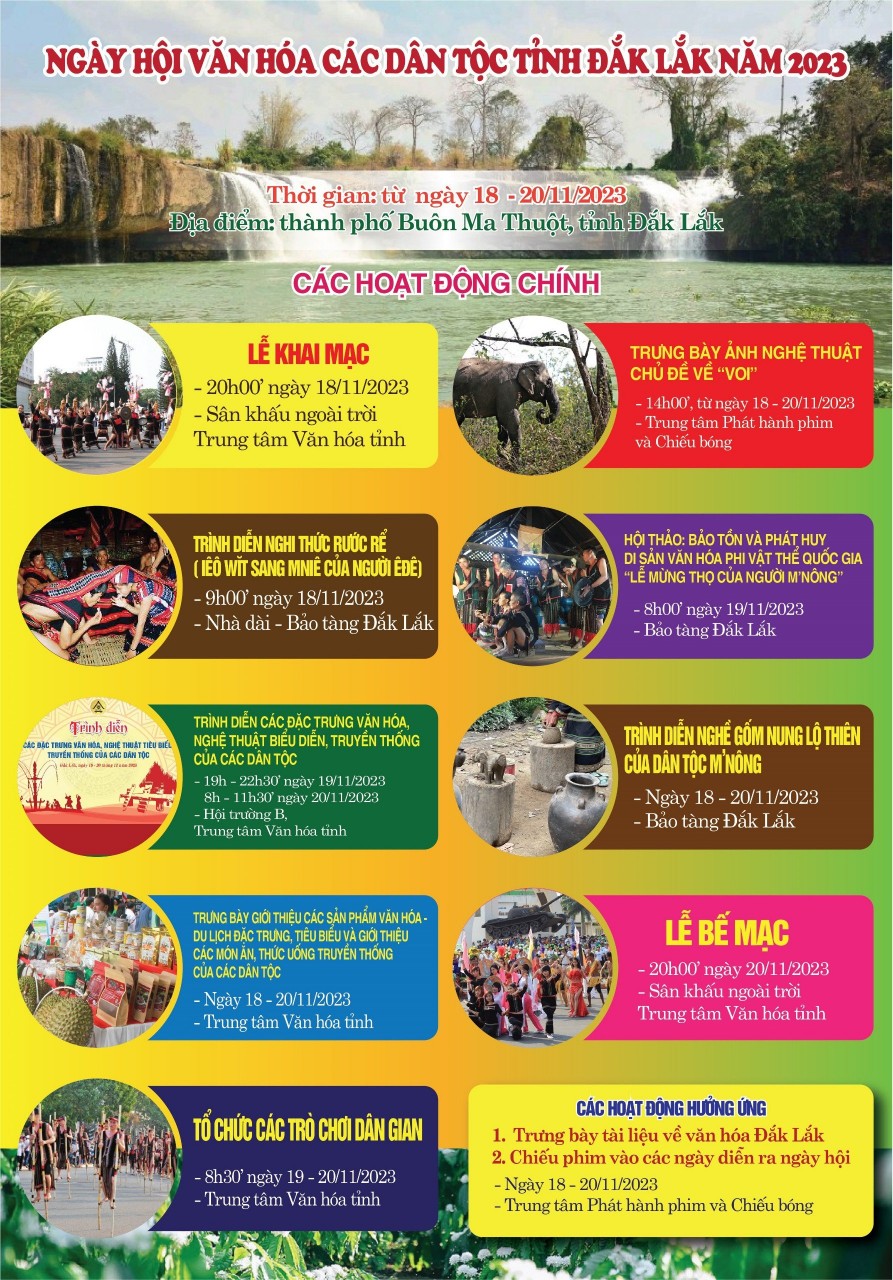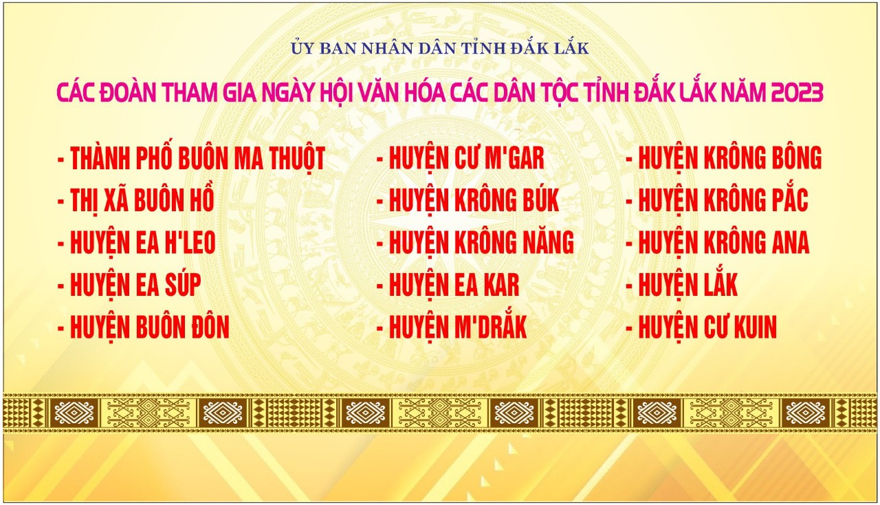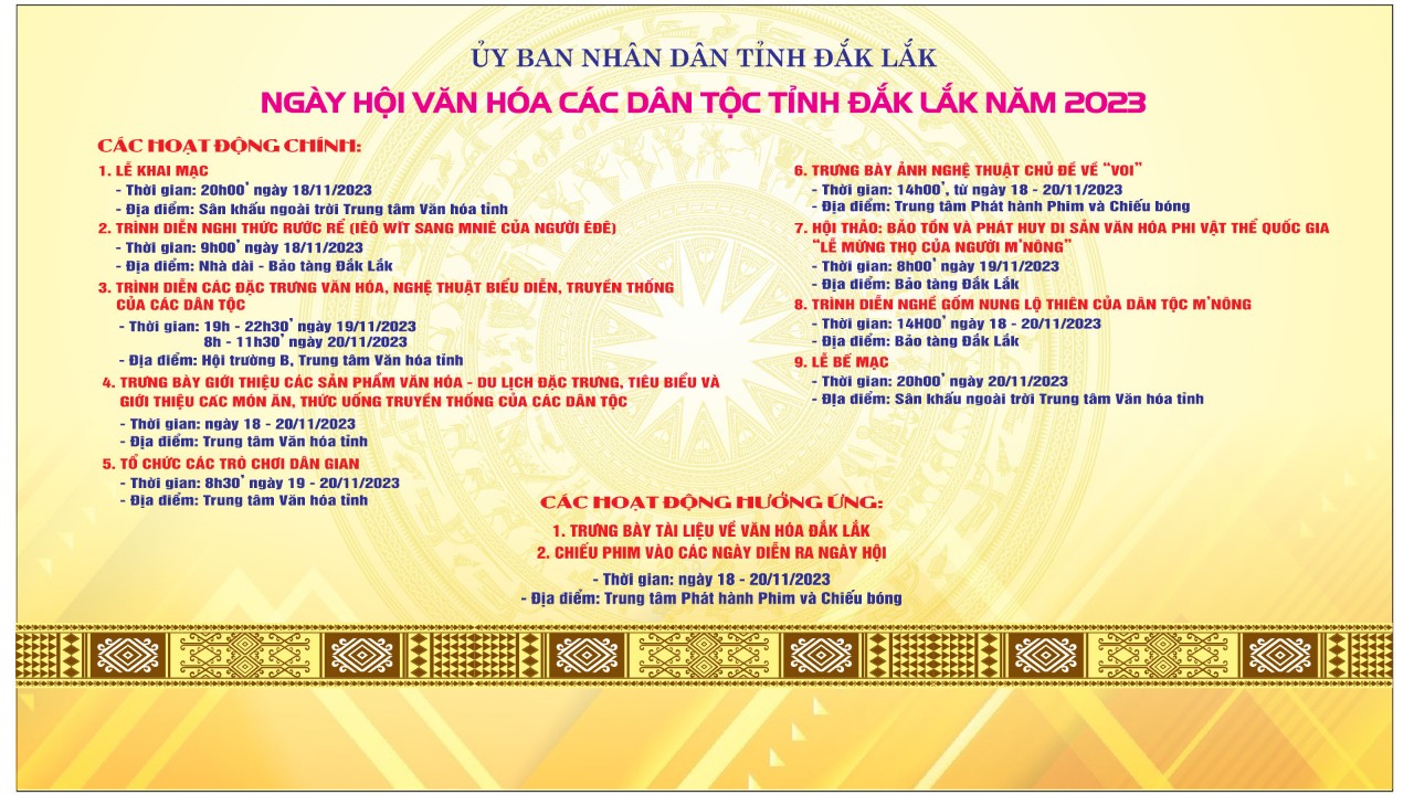 “Ngày hội Văn hóa các dân tộc tỉnh Đắk Lắk” năm 2023 diễn ra từ ngày 18/11 – 20/11/2023 với sự tham gia của các đội nghệ nhân đến từ 15 huyện, thị xã, thành phố trong tỉnh.