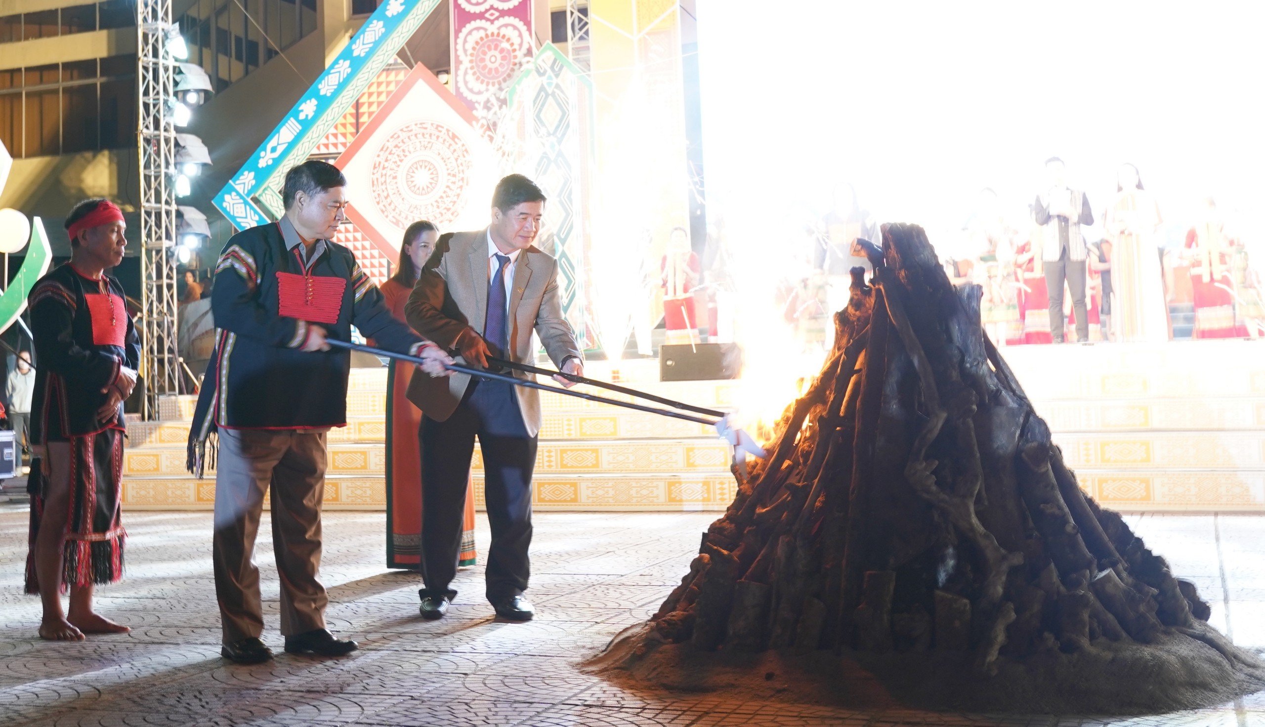 Phó Bí thư Thường trực Tỉnh ủy Phạm Minh Tấn, Phó Chủ tịch UBND tỉnh Nguyễn Thiên Văn thắp sáng ngọn lửa đêm khai mạc