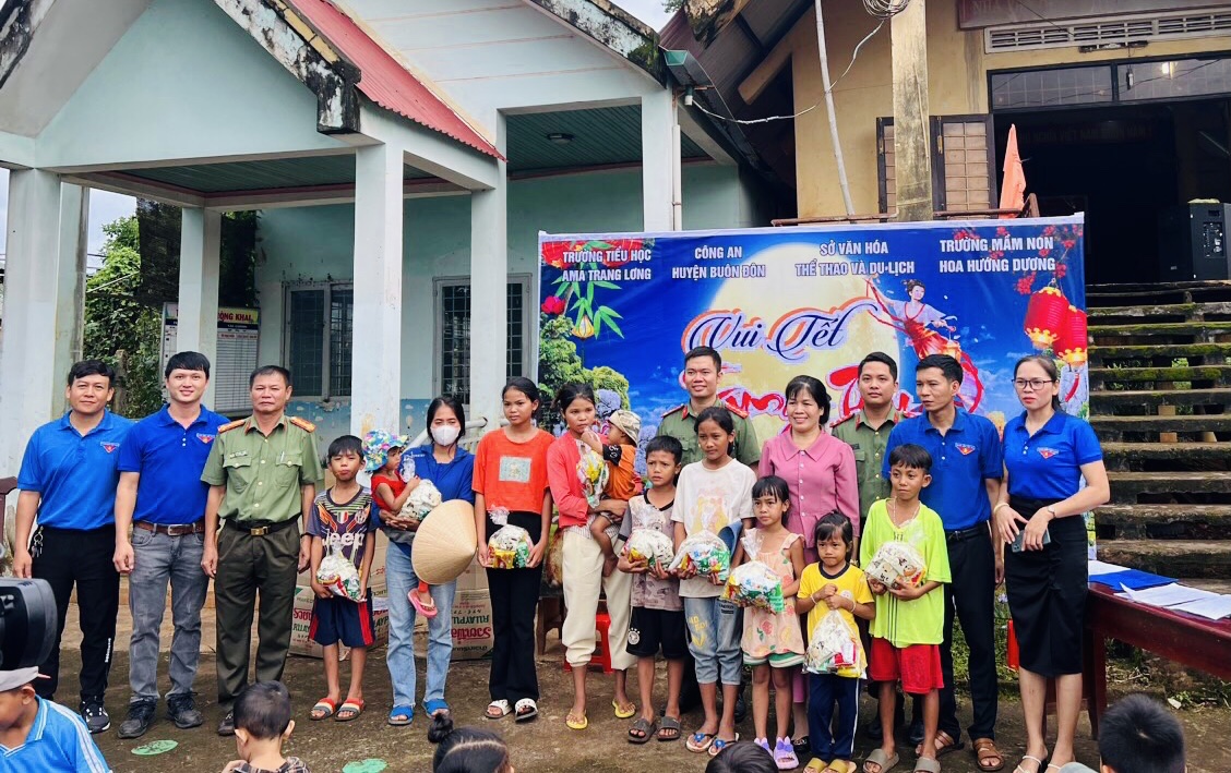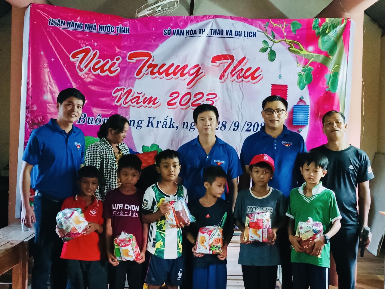 Nhân dịp tết Trung thu, chiều ngày 28/9/2023 (nhằm ngày 14/8 âm lịch), Đoàn cơ sở Sở Văn hóa, Thể thao và Du lịch phối hợp với Công đoàn cơ sở, Công an huyện Buôn Đôn, Chi đoàn Ngân hàng Nhà nước tỉnh, các đơn vị kết nghĩa và Ban Tự quản buôn tổ chức hoạt động vui tết Trung thu cho các em thiếu nhi tại buôn Tung Đrắk, xã Ea Drông, thị xã Buôn Hồ và buôn Knia 1, xã Ea Bar, huyện Buôn Đôn.